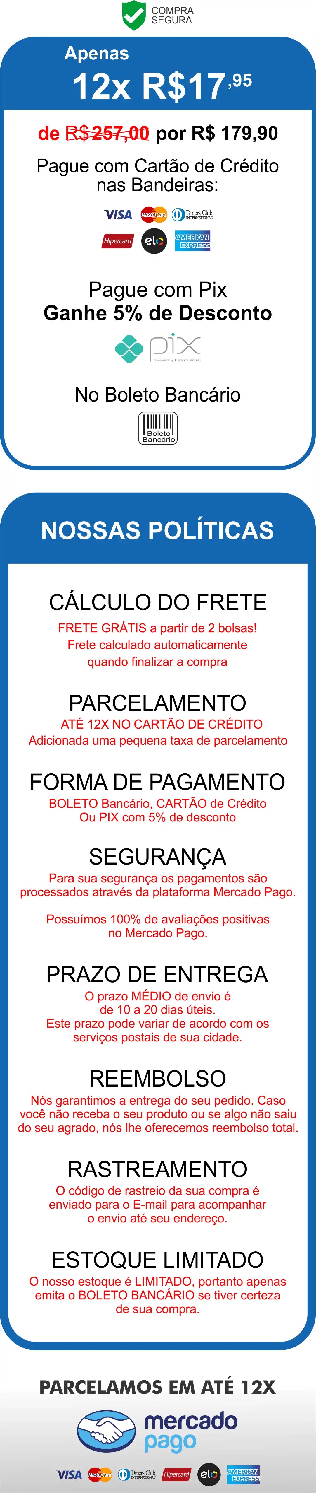 Para sua segurança os pagamentos são processados pelo Mercado Pago, tem total segurança e garantia em realizar suas compras.